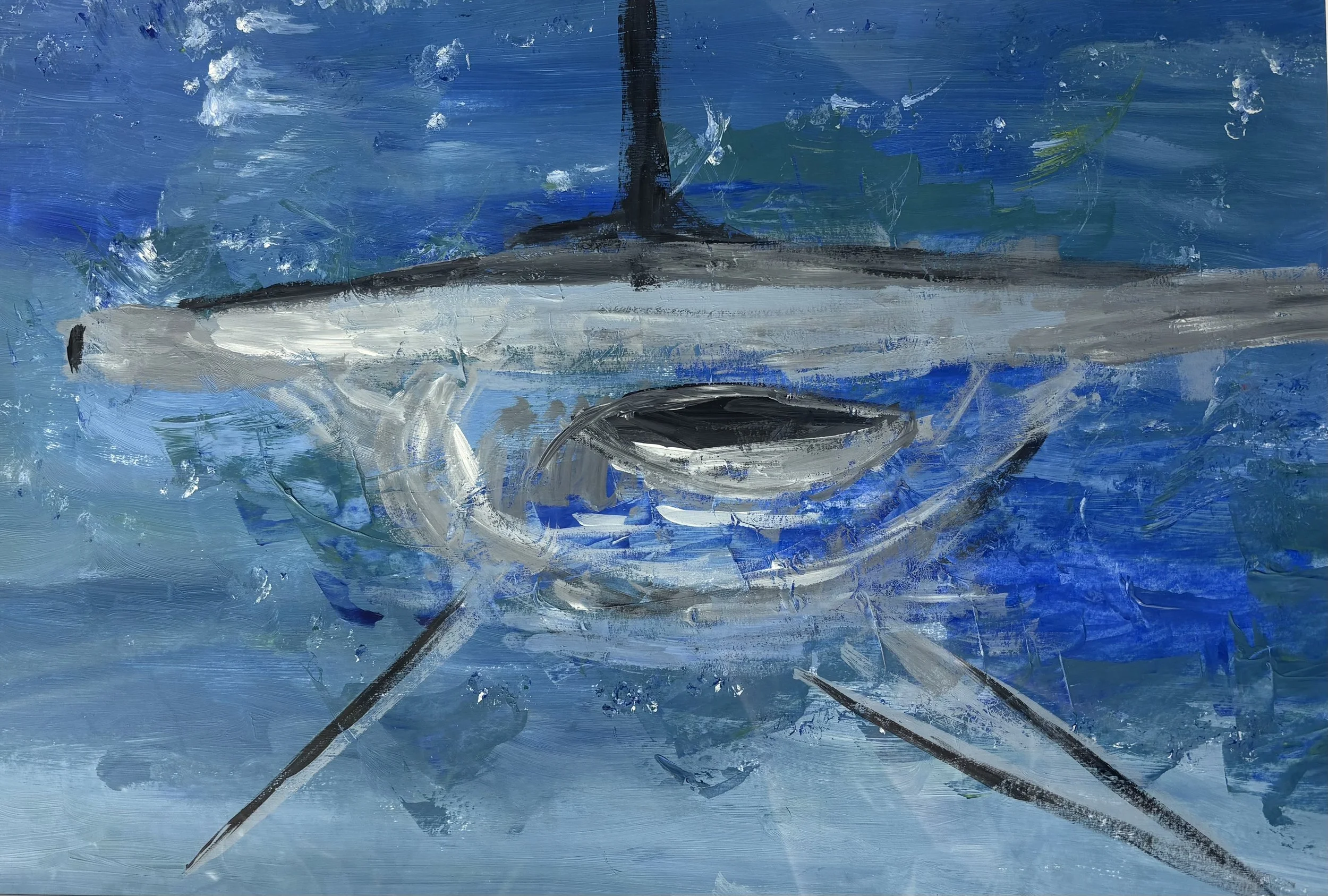 Abstract hammerhead shark painting, acrylic on paper, painted April 2026