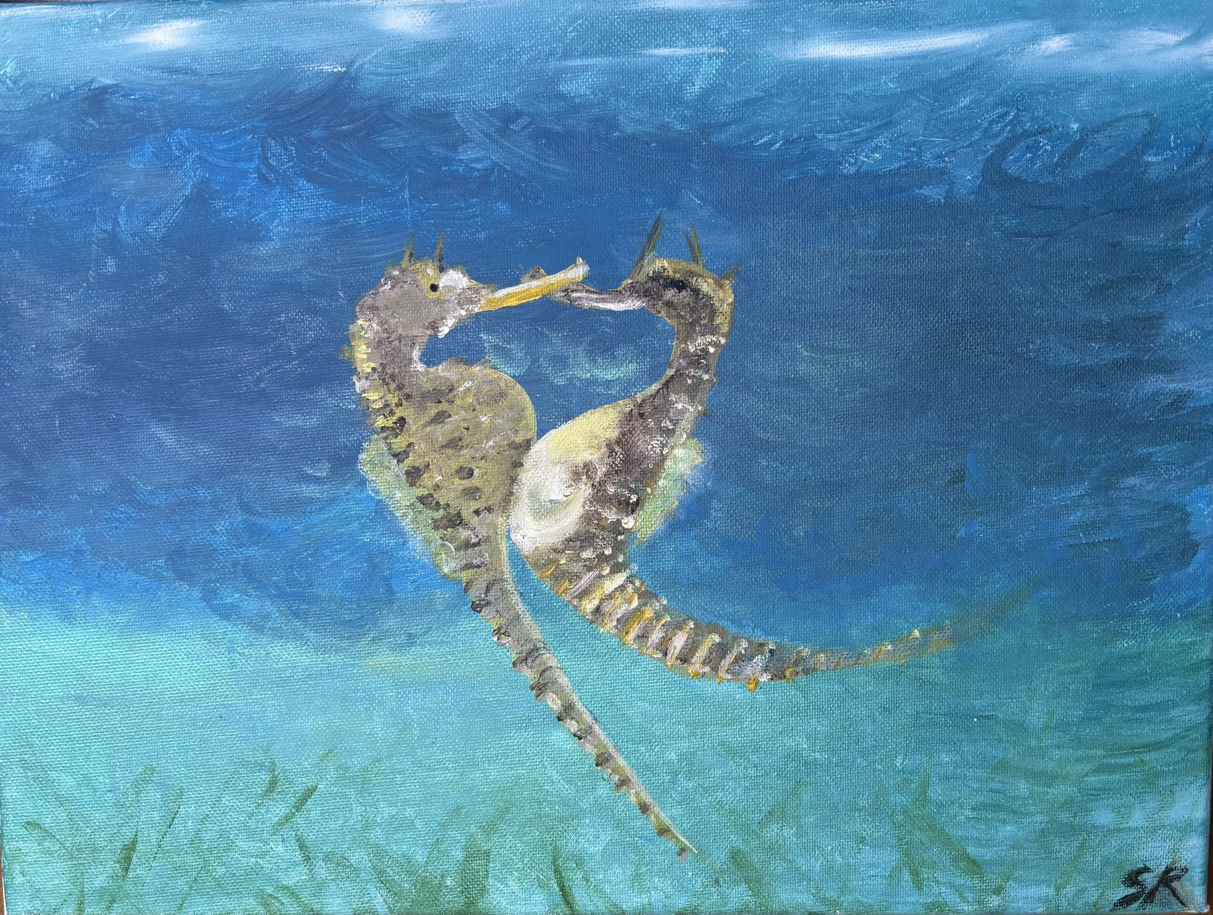 Pregnant seahorses dancing, metallic acrylic on canvas, painted March 2026